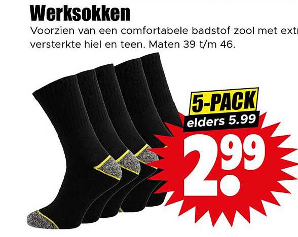 Op dit moment kun je deze 5-pack werksokken aanschaffen voor slechts €2,99, terwijl de normale prijs €5,99 is. Dat betekent een directe besparing van €3,00! Deze aanbieding is perfect voor degenen die willen besparen zonder in te boeten op kwaliteit.