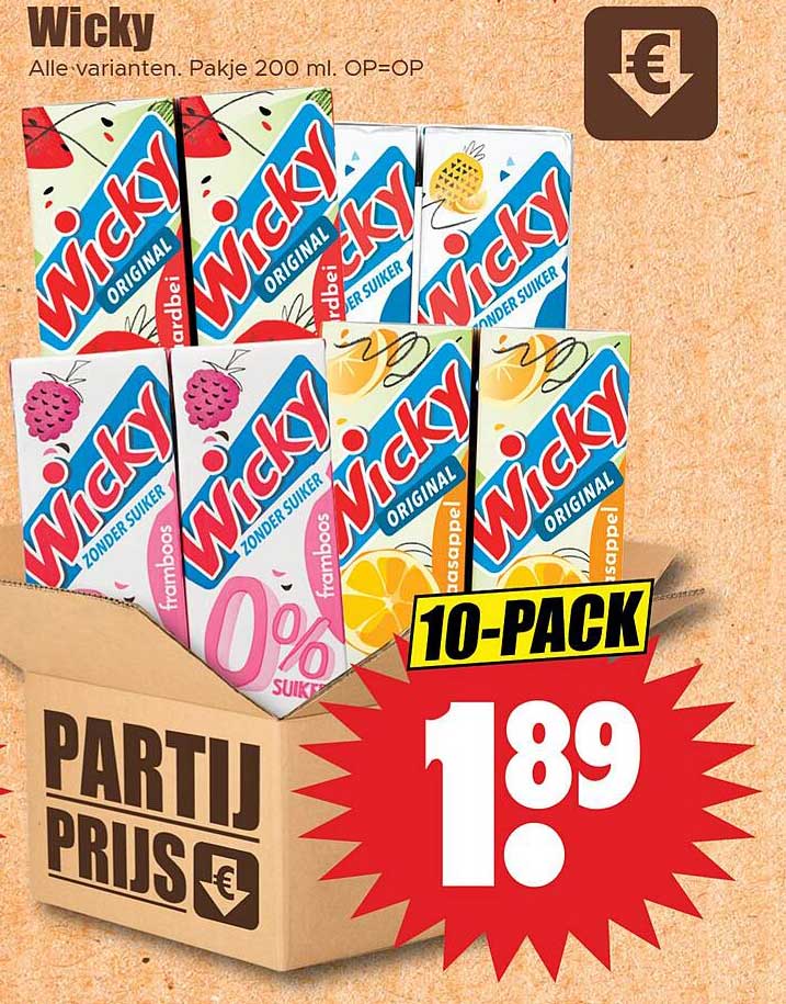 Voor slechts €1,89 krijg je een 10-pack van deze heerlijke drankjes, wat de prijs per drankje ongelooflijk voordelig maakt. Vergelijk dit met de normale prijs en je zult zien dat je een fantastische deal te pakken hebt. Dit is de perfecte gelegenheid om voor een lage prijs een voorraad Wicky in huis te halen!