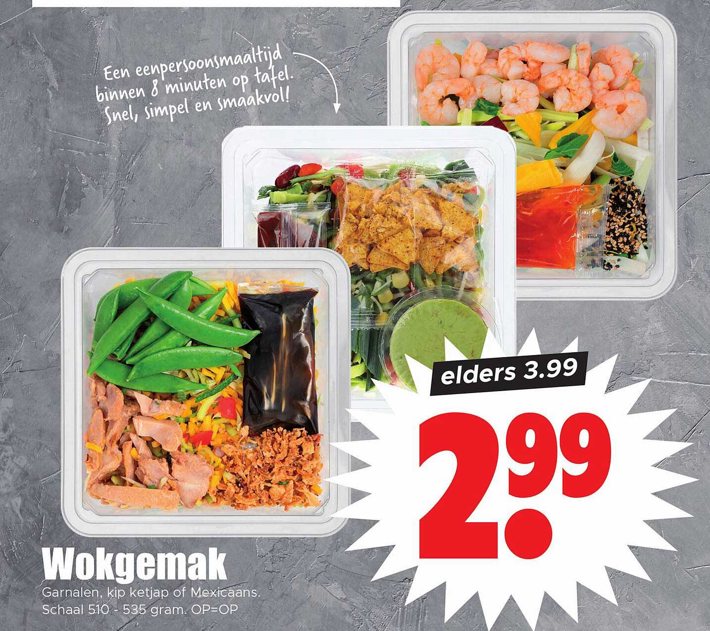 Bekijk nu de Wokgemak Garnalen, kip ketjap of Mexicaans. Schaal 510 - 535 gram. OP=OP aanbieding in de Dirk folder. Deze aanbieding is geldig van 04-04-2025 tot en met 06-04-2025.