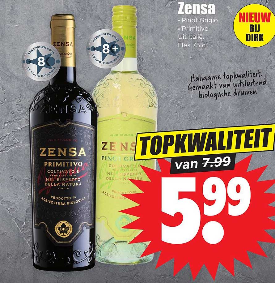 Bekijk de Zensa Pinot Grigio, Zensa Primitivo aanbieding bij Dirk! Deze fantastische aanbieding is nu beschikbaar in de nieuwste Dirk folder. Profiteer van deze kans en bespaar flink op je aankoop.