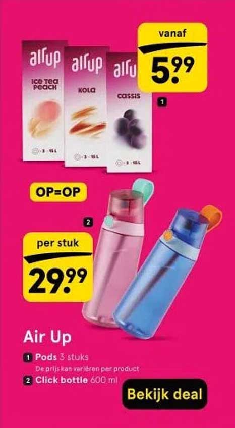 Welkom op deze pagina waar we een geweldige aanbieding presenteren van Air Up! Als je op zoek bent naar een innovatieve manier om je water op smaak te brengen, dan is dit het moment om deze unieke producten aan te schaffen. Air Up biedt een frisse manier om je hydratatie te verbeteren, en deze aanbieding maakt het nog aantrekkelijker. De beperkte geldigheid van deze aanbieding houdt in dat je snel moet zijn, dus mis het niet!
