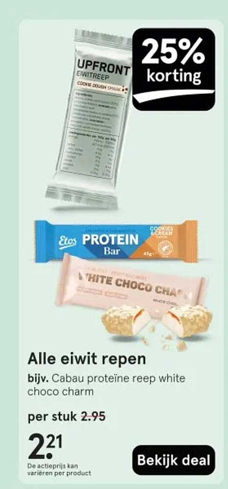 Ben je op zoek naar een lekkere en gezonde snack? Dan heb ik goed nieuws voor je! Op deze pagina vind je een geweldige aanbieding voor eiwitrepen van Etos, perfect voor onderweg of als energietussendoortje. Met een korting van 25% haal je deze voedzame repen nu voor een scherpe prijs in huis!