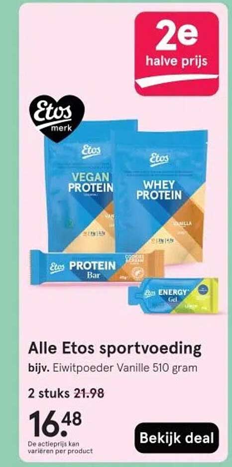 Ontdek de geweldige Alle Etos Sportvoeding aanbieding in de nieuwste Etos folder. Naast deze aanbieding vind je nog veel meer aantrekkelijke kortingen. Je kunt de Alle Etos Sportvoeding eenvoudig online bestellen via de Etos website of kopen in een winkel bij jou in de buurt.