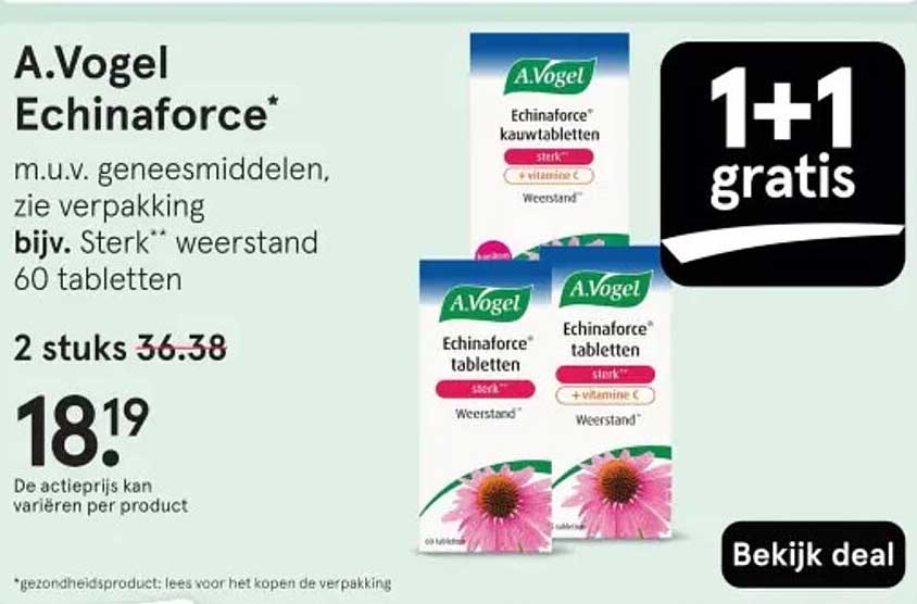Ontdek de voordelen van A.Vogel Echinaforce, een krachtig supplement dat je weerstand ondersteunt. Deze aanbieding brengt niet alleen een aantrekkelijke korting maar ook een unieke 1+1 gratis deal, waardoor je optimaal kunt profiteren van de voordelen van dit product. Perfect voor de herfstperiode, waarin je immuunsysteem extra ondersteuning kan gebruiken!