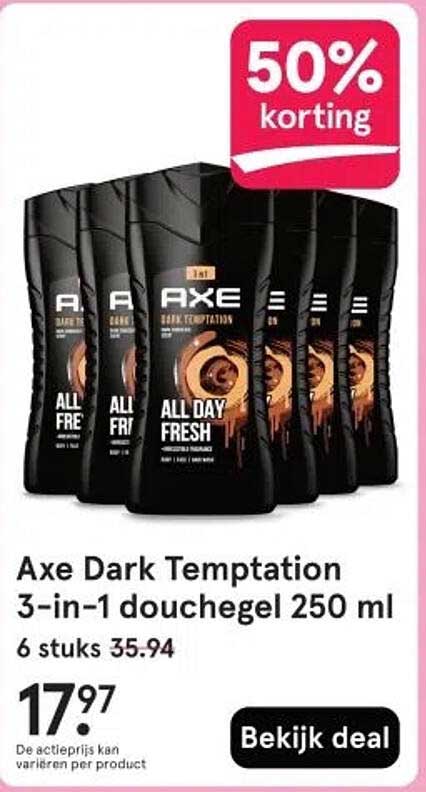 Heb je behoefte aan een verfrissende start van je dag? Kijk dan niet verder! De Axe Dark Temptation 3-in-1 douchegel is nu beschikbaar in een aantrekkelijke aanbieding. Deze populaire douchegel geeft je niet alleen een schone en frisse uitstraling, maar doet dat ook met een onweerstaanbare geur. Het is de perfecte combinatie van een douchegel, shampoo en scheergel – ideaal voor de drukke man van vandaag!