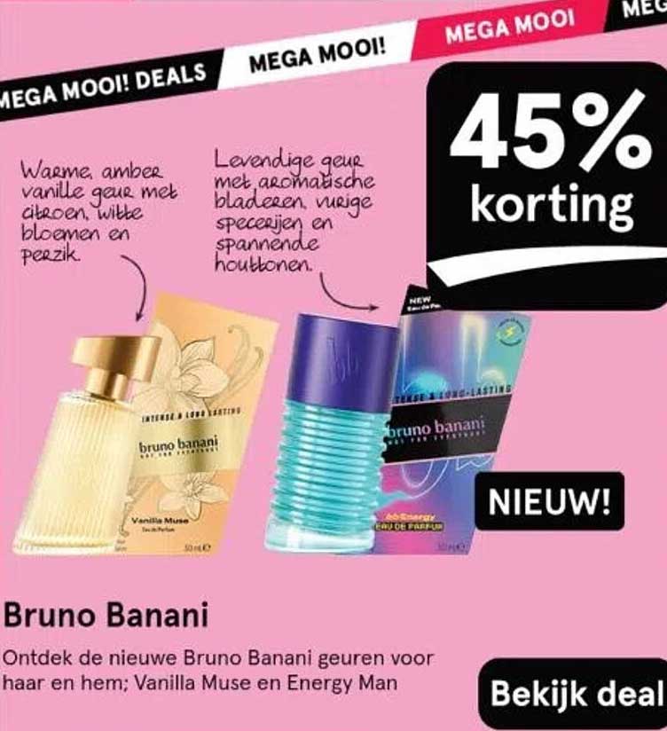 Bewonder de nieuwste geurcreaties van Bruno Banani! De geuren 'Vanilla Muse' en 'Energy Man' zijn perfect voor zowel haar als hem. Dit is dé kans om je parfumcollectie een frisse boost te geven met deze heerlijke aroma's. Met een korting van maar liefst 45% op deze geuren kan je nu genieten van luxe voor een fractie van de prijs!