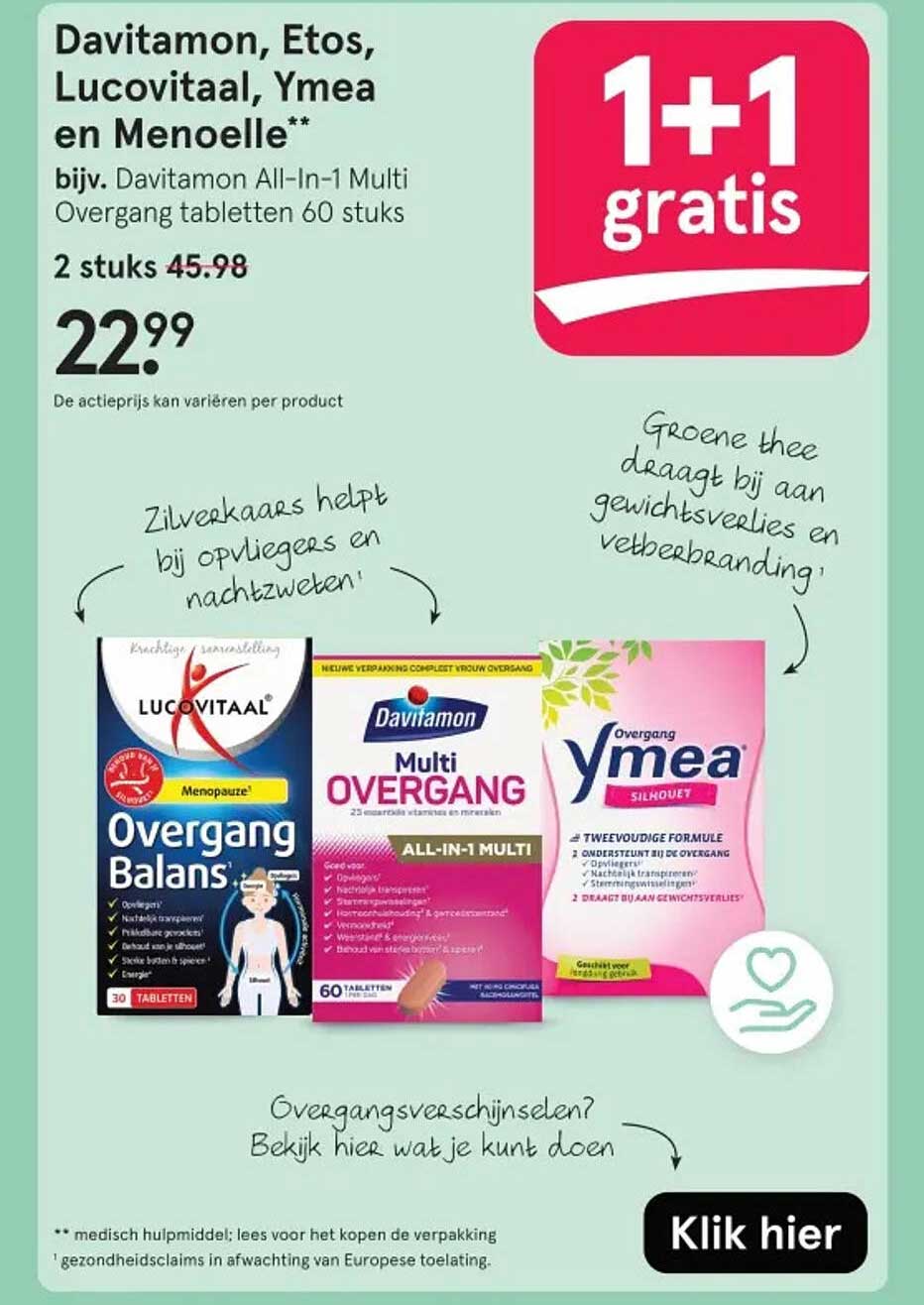 Bekijk nu de Davitamon, Etos, Lucovitaal, Ymea en Menoeëlle bijv. Davitamon All-In-1 Multi Overgang tabletten 60 stuks aanbieding in de Etos folder. Deze aanbieding is geldig van 14-04-2025 tot en met 20-04-2025.