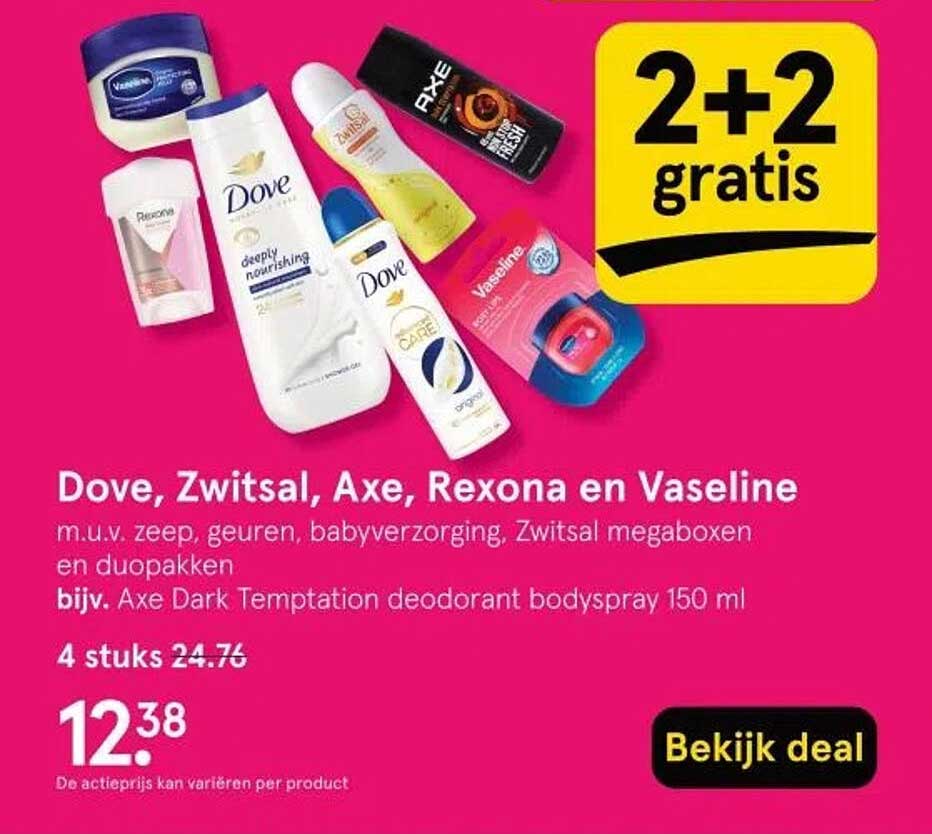 Op zoek naar een geweldige deal voor persoonlijke verzorgingsproducten? Dan is deze aanbieding zeker wat voor jou! Met de actie bij Etos krijg je nu een aantrekkelijk aanbod van populaire merken zoals Dove, Zwitsal, Axe, Rexona en Vaseline. Dit is jouw kans om je voorraad aan te vullen met kwaliteitsproducten voor een zeer scherpe prijs.