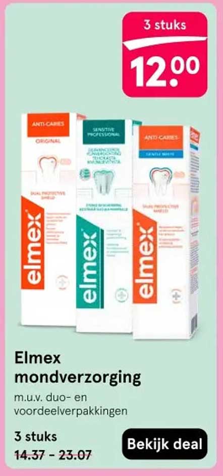 Bekijk de Elmex Mondverzorging aanbieding bij Etos! Deze fantastische aanbieding is nu beschikbaar in de nieuwste Etos folder. Profiteer van deze kans en bespaar flink op je aankoop.