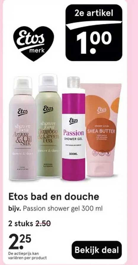 Ontdek de geweldige Etos Bad En Douche aanbieding in de nieuwste Etos folder. Naast deze aanbieding vind je nog veel meer aantrekkelijke kortingen. Je kunt de Etos Bad En Douche eenvoudig online bestellen via de Etos website of kopen in een winkel bij jou in de buurt.