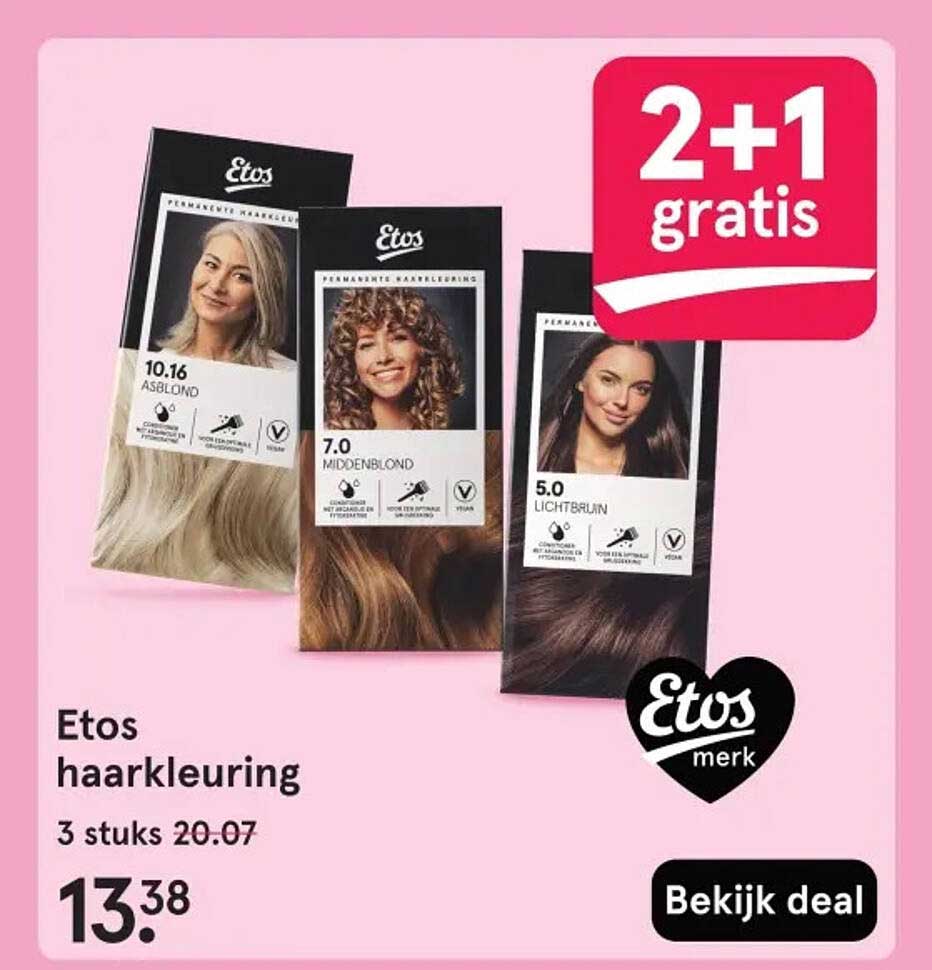 Ben je op zoek naar een geweldige manier om je haarkleur te veranderen of op te frissen? Kijk dan niet verder! Op deze pagina vind je een fantastische aanbieding van Etos voor haarkleur, waarbij je drie pakketten kunt kopen voor slechts 13,38 euro. Dit is de perfecte kans om die nieuwe look uit te proberen die je altijd al wilde. Of je nu een subtiele verandering wilt of een gedurfde nieuwe tint, met deze aanbieding kun je eindeloos variëren!