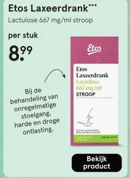 Bekijk nu de Etos Laxeerdrank*** Lactulose 667 mg/ml stroop aanbieding in de Etos folder. Deze aanbieding is geldig van 14-07-2025 tot en met 27-07-2025.
