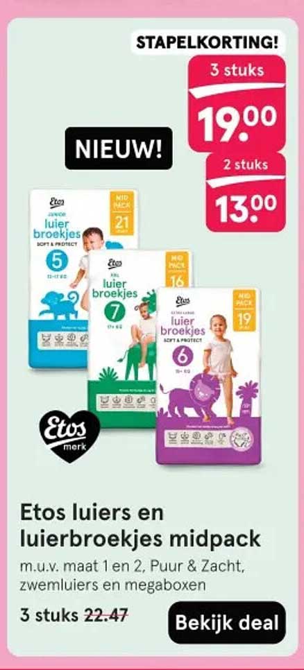 Bekijk nu de Etos luiers en luierbroekjes midpack aanbieding in de Etos folder. Deze aanbieding is geldig van 14-04-2025 tot en met 20-04-2025.