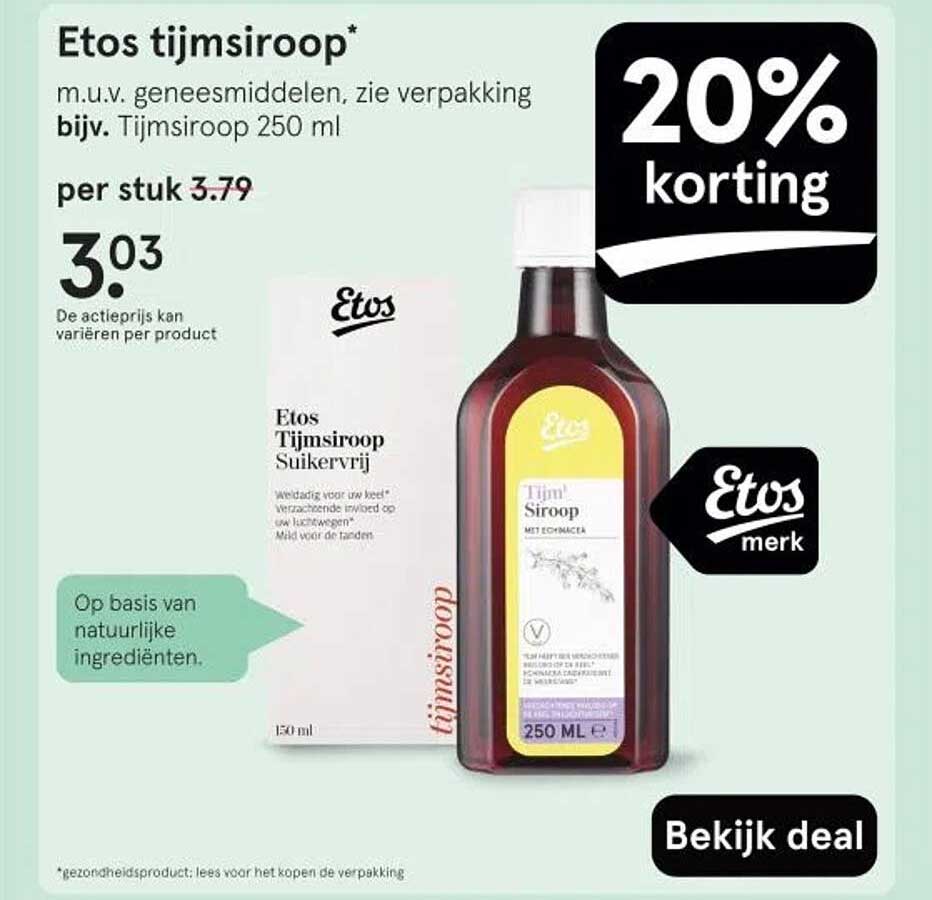 Als je zoekt naar een natuurlijk middel voor je keel, dan is de Etos tijmsiroop een uitstekende keuze! Met een actieprijs van slechts €3,03 per 250 ml, bespaar je nu 20% ten opzichte van de reguliere prijs van €3,79. Dit is hét moment om deze heerlijke siroop aan je huisapotheek toe te voegen.