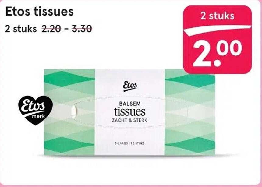 Heb je altijd tissues nodig in je tas, auto of thuis? Dan is deze aanbieding van Etos precies wat je zoekt! Met de Etos tissues, zacht en sterk, ben je altijd voorbereid op elk moment. Of het nu gaat om een vervelende niesbui, een knoeipartij of gewoon om je handen even op te frissen, deze tissues doen het werk. Voor slechts €2,00 voor twee pakjes van 90 tissues, kun je tegen een voordelige prijs je voorraad aanvullen. Waarom meer betalen als je deze slimme deal kunt scoren?