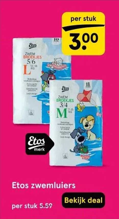 Bekijk nu de Etos zwemmuiers aanbieding in de Etos folder. Deze aanbieding is geldig van 01-09-2025 tot en met 07-09-2025.