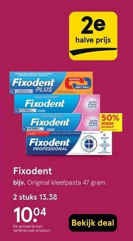 Ben je op zoek naar een betrouwbare oplossing voor het bevestigen van je kunstgebit? Dan is dit het moment om naar de aanbieding van Fixodent te kijken! Tijdens de actie bij Etos krijg je twee tubes van de Original kleefpasta voor een geweldig prijs. Het biedt niet alleen een sterke hechting, maar zorgt ook voor extra comfort en een natuurlijk gevoel. Met deze aanbieding ben je verzekerd van kwaliteit voor een scherpe prijs.