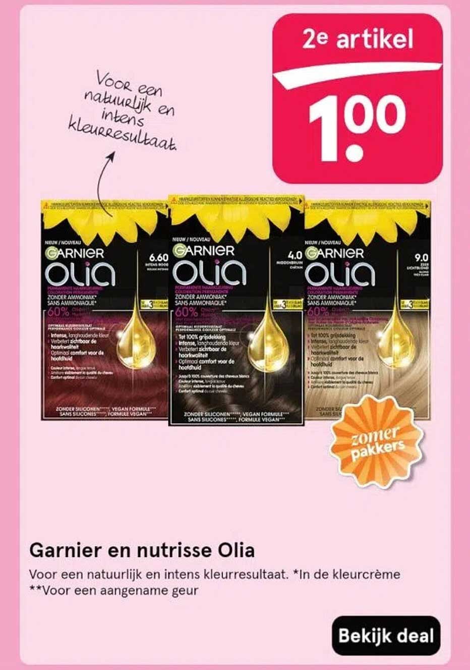 Met de aanbieding van deze week krijg je de tweede Garnier Olia voor slechts €1,00! Dit is een geweldige kans om twee kleuren aan te schaffen voor de prijs van één. Dit kan je helpen om verschillende looks uit te proberen zonder je budget te overschrijden. Naast de geweldige prijs, is de kwaliteit van Garnier Olia absoluut ongeëvenaard, waardoor dit een aanbieding is die je niet wilt missen!