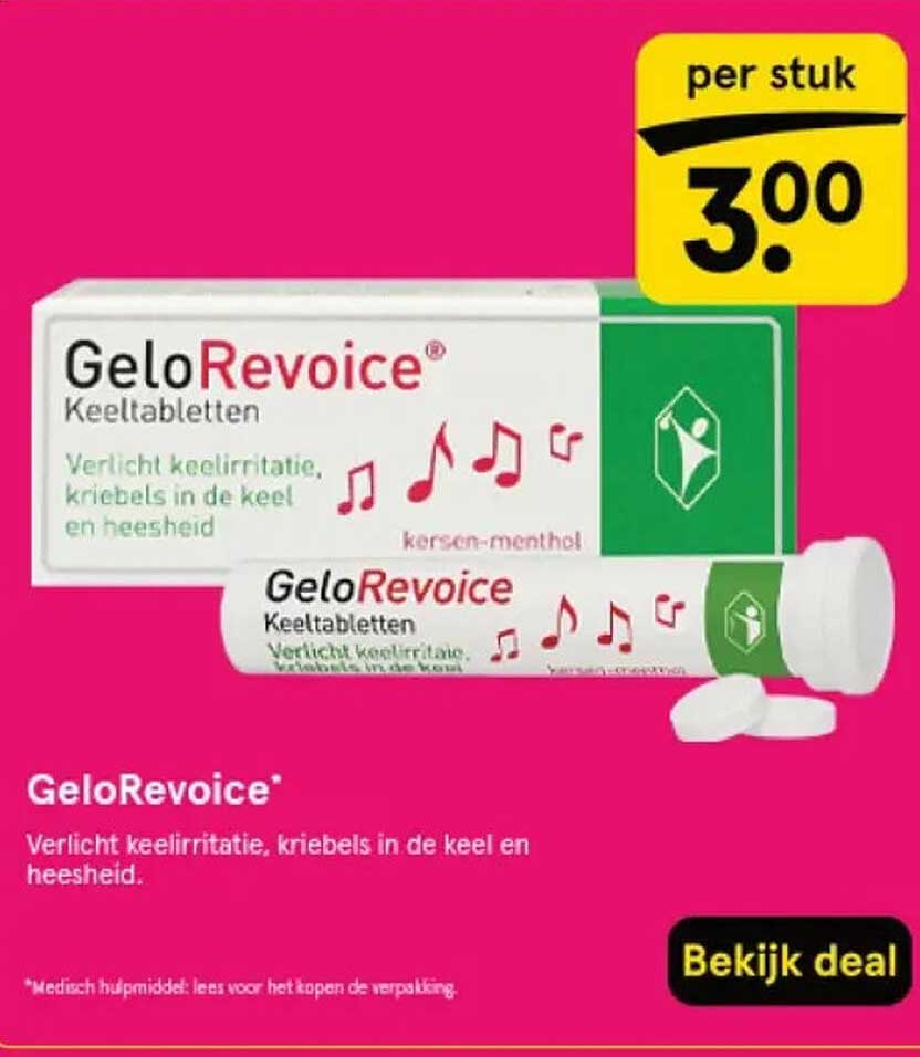 Bij Etos zijn de GeloRevoice Keeltabletten nu verkrijgbaar voor slechts €3,00 per stuk! Dit is een geweldige prijs in vergelijking met de gebruikelijke prijzen, waardoor je nu de kans hebt om je voorraad aan te vullen zonder je budget te overschrijden. Wie wil er nu niet voordelig de zorgen van een keelpijn aanpakken?