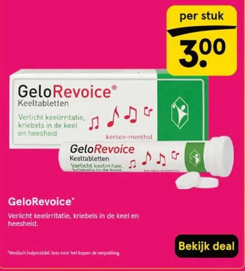 Als je last hebt van een flinke keelprik of irritatie, dan is de aanbieding die je hier tegenkomt exact wat je nodig hebt! GeloRevoice keeltabletten zijn speciaal ontwikkeld om keelpijn te verlichten en zorgen voor een aangename verzachting. De combinatie van kersen en menthol maakt deze tabletten niet alleen effectief, maar ook nog eens smaakvol. Een ideale oplossing dus voor de verandering van seizoenen of na een lange dag praten!