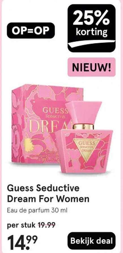 Ben je op zoek naar een verleidelijke geur die je zelfvertrouwen een boost geeft? Maak kennis met de Guess Seductive Dream For Women! Deze prachtige eau de parfum van 30 ml is nu beschikbaar met een aantrekkelijke korting, waardoor dit het perfecte moment is om jezelf of een geliefde te trakteren op een luxe geur zonder de bank te breken.