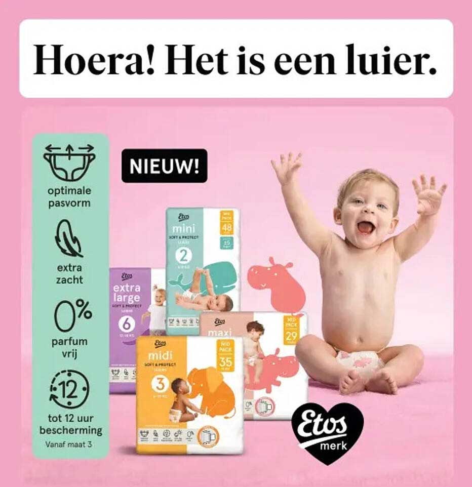 Mis deze kans niet! Bezoek hier om alles te ontdekken wat de Etos-folder te bieden heeft. Naast deze geweldige luiers vind je nog veel meer aanbiedingen die jouw leven gemakkelijker maken.