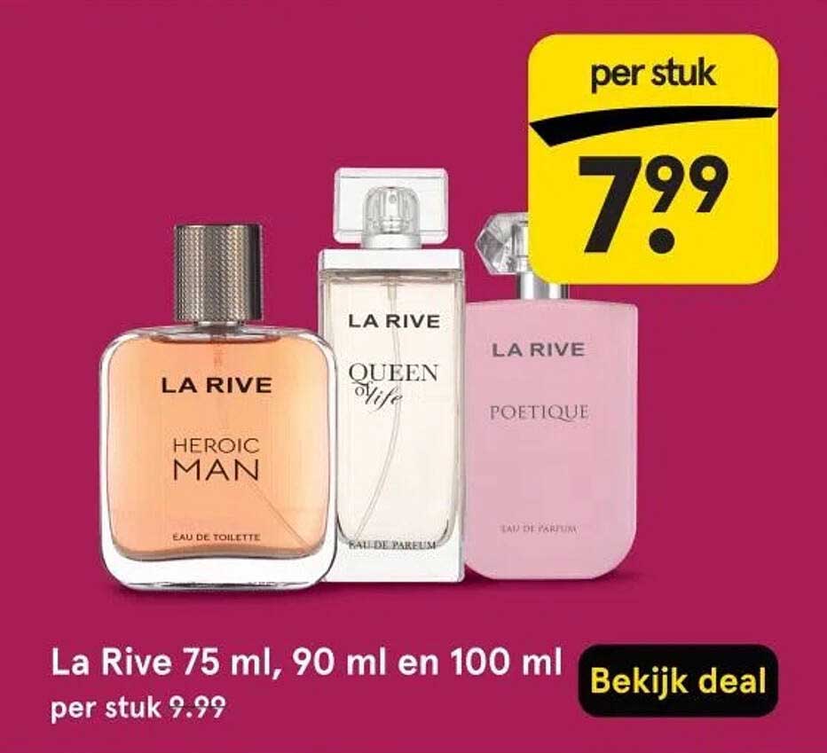 Bekijk nu de La Rive 75 ml, 90 ml en 100 ml per stuk 7,99 aanbieding in de Etos folder. Deze aanbieding is geldig van 19-05-2025 tot en met 25-05-2025.