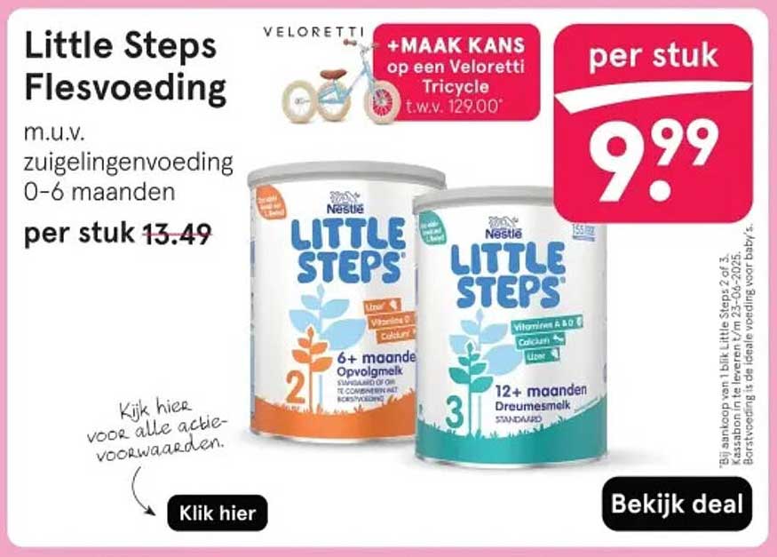 Heb je een kleintje thuis en ben je op zoek naar de beste voeding? Dan is deze aanbieding van Little Steps Flesvoeding echt iets voor jou! Van 2 juni tot en met 15 juni 2025 kun je profiteren van een speciale prijs van slechts €9,99 per stuk, in plaats van de gebruikelijke €13,49. Dat is een geweldige kans om je baby de beste kwaliteit voeding te geven voor een scherpe prijs!
