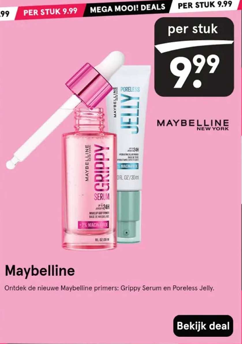 Ben je op zoek naar de perfecte base voor je make-up? Dan is deze aanbieding van Maybelline iets voor jou! Ontdek de nieuwe Maybelline primers: Grippy Serum en Poreless Jelly. Deze producten zijn speciaal ontwikkeld om je make-up langer te laten zitten en een prachtige, egale huid te creëren. Met een prijs van slechts €9,99 per stuk maak je een slimme keuze voor je beauty routine.