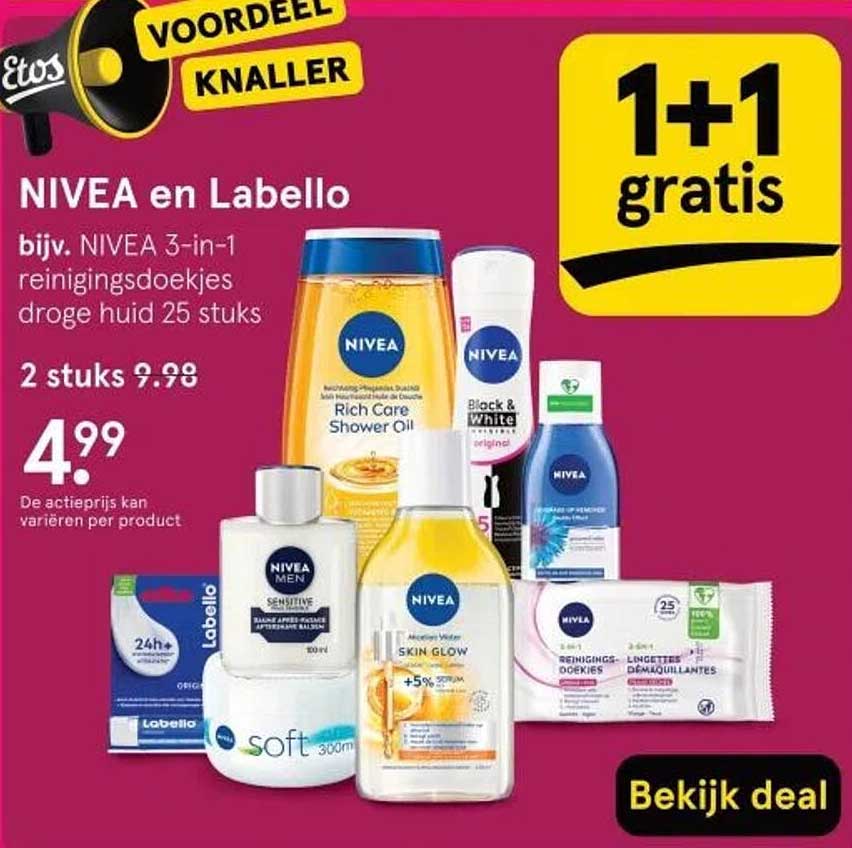 Bekijk nu de NIVEA en Labello 1+1 gratis aanbieding in de Etos folder. Deze aanbieding is geldig van 27-10-2025 tot en met 02-11-2025.