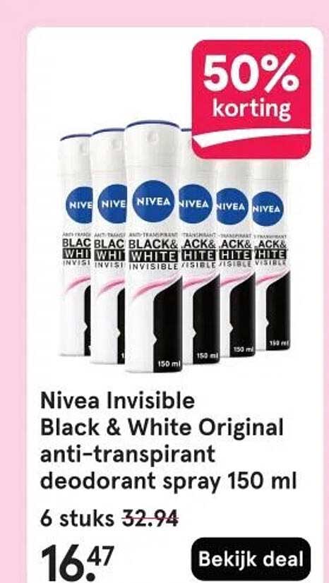 Wil je direct op de hoogte zijn zodra de Nivea Invisible Black & White Original Anti-Transpirant Deodorant Spray 150 Ml in de aanbieding is? Meld je aan voor onze aanbiedingen-alert. Zo krijg je een melding zodra het product tegen een voordelige prijs beschikbaar is.