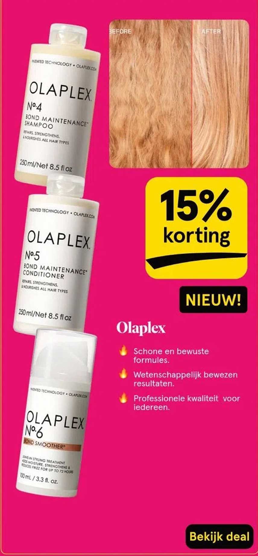 Ben je op zoek naar haarproducten die écht werken? Daar is deze aanbieding van Olaplex ideaal voor! Met een aantrekkelijke korting van 15% heb je de kans om de kwaliteitsproducten van Olaplex in huis te halen. Deze lijn is ontwikkeld om je haar te herstellen, versterken en te voeden, en dat allemaal voor een verrassend lage prijs. Boude claims? Nee, enkel bewezen resultaten!