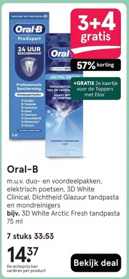 Als je op zoek bent naar een effectieve manier om je mondgezondheid te verbeteren, dan is dit de kans die je niet wilt missen! Oral-B biedt een fantastische aanbieding voor hun tandpasta waarmee je jouw tanden optimaal kunt verzorgen. Met deze aanbieding krijg je hoogwaardige tandpasta tegen een scherpere prijs, waardoor het nooit eenvoudiger is geweest om je mondverzorging naar een hoger niveau te tillen.