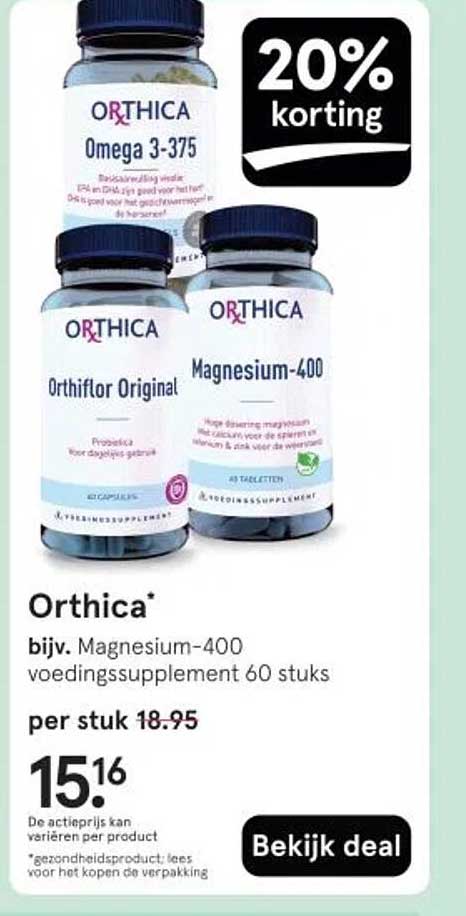 Ben je op zoek naar een manier om je gezondheid een boost te geven? Dan is deze aanbieding van Orthica perfect voor jou! Met een unieke formule van hoogwaardige ingrediënten biedt de Magnesium-400 ondersteuning voor je algehele welzijn. Van 13 tot en met 19 oktober kun je profiteren van maar liefst 20% korting op dit geweldige voedingssupplement. Hierdoor wordt gezond leven gemakkelijker én voordeliger!