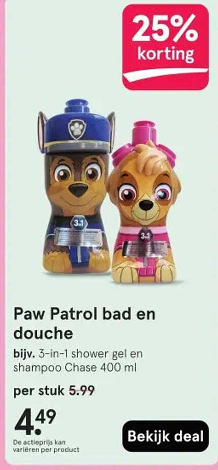 Bekijk nu de Paw Patrol bad en douche aanbieding in de Etos folder. Deze aanbieding is geldig van 12-05-2025 tot en met 18-05-2025.