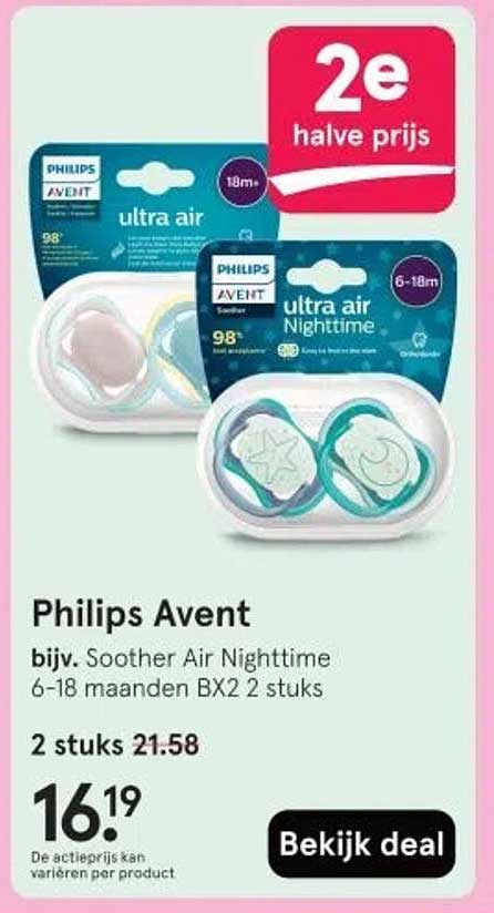 Bekijk nu de Philips Avent bijv. Soother Air Nighttime aanbieding in de Etos folder. Deze aanbieding is geldig van 17-03-2025 tot en met 23-03-2025.