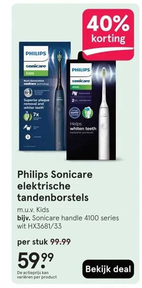 Bekijk de Philips Sonicare Elektrische Tandenborstels aanbieding bij Etos! Deze fantastische aanbieding is nu beschikbaar in de nieuwste Etos folder. Profiteer van deze kans en bespaar flink op je aankoop.