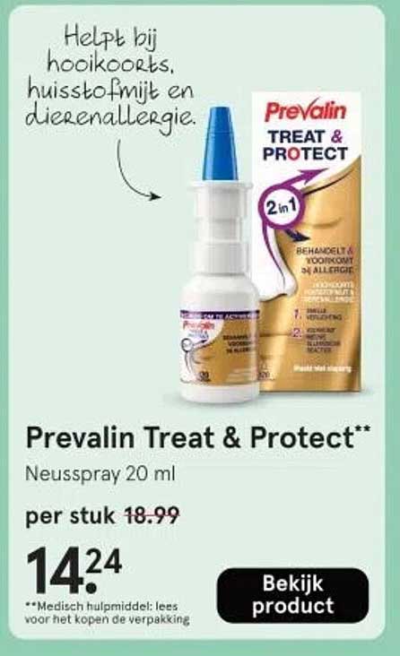 Bekijk de Prevalin Treat & Protect** Neusspray aanbieding bij Etos! Deze fantastische aanbieding is nu beschikbaar in de nieuwste Etos folder. Profiteer van deze kans en bespaar flink op je aankoop.