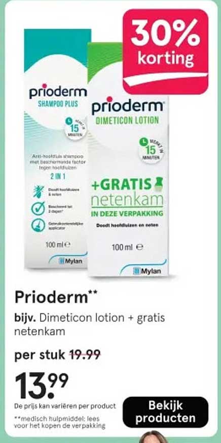 Heb je last van luizen of hoofdluis? Dan is deze aanbieding van Prioderm precies wat je nodig hebt! Met de unieke 2-in-1 formule van Prioderm Shampoo Plus en Dimeticon Lotion, ben je verzekerd van een effectieve behandeling. Tijdens deze actie krijg je ook een gratis netenkam, waardoor je eenvoudig het resultaat kunt controleren.