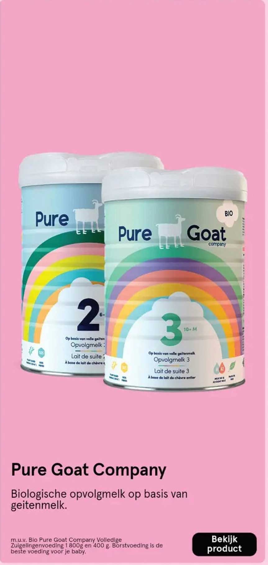 Bekijk nu de Pure Goat Company Biologische opvolgmelk op basis van geitenmelk aanbieding in de Etos folder. Deze aanbieding is geldig van 23-06-2025 tot en met 29-06-2025.