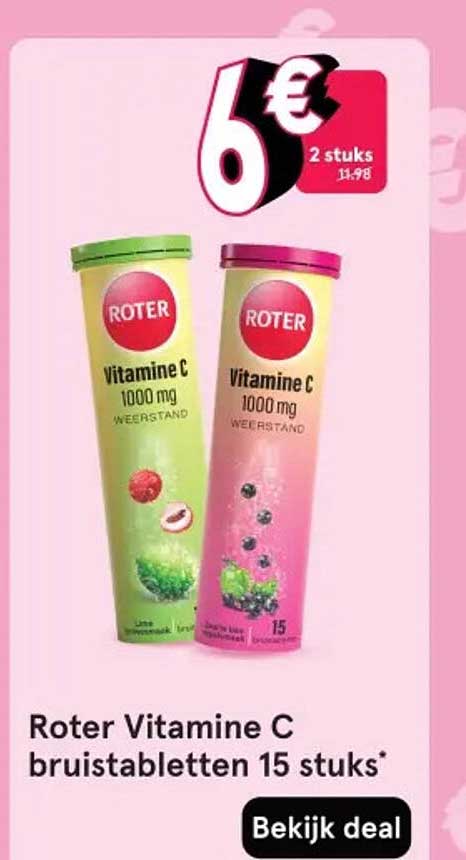 Ben je op zoek naar een gemakkelijke manier om je weerstand een boost te geven? Dan is deze aanbieding iets voor jou! De Roter Vitamine C bruistabletten zijn ideaal voor iedereen die zijn dagelijkse dosis vitamine C op een lekkere en verfrissende manier wil binnenkrijgen. Deze aanbieding is geldig van 7 april tot en met 13 april 2025 en biedt je de kans om deze fantastische producten voor een uitstekende prijs aan te schaffen.