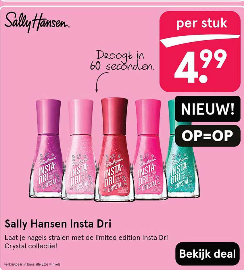 Is het tijd om je nagels in de schijnwerpers te zetten? Dan is deze aanbieding iets voor jou! De nieuwe limited edition Sally Hansen Insta Dri Crystal collectie is nu beschikbaar bij Etos. Deze nagellak is speciaal ontworpen om je nagels te laten stralen en droogt in slechts 60 seconden. Perfect voor drukke mensen die geen tijd te verliezen hebben maar er toch fantastisch uit willen zien.