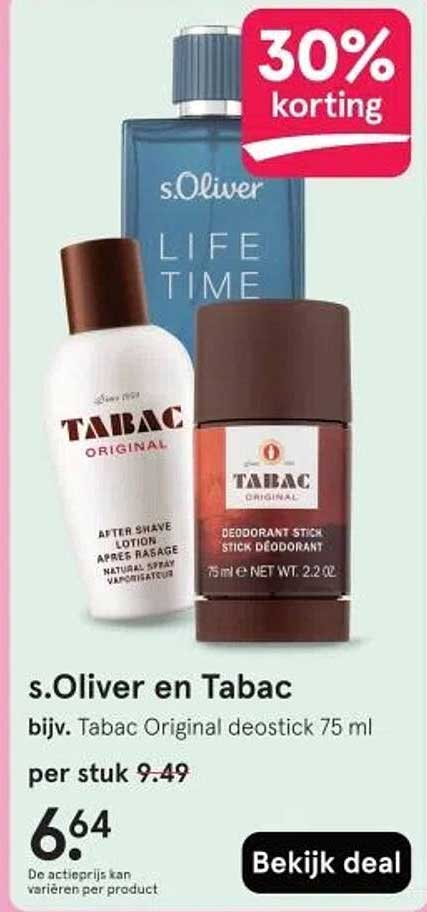 Bekijk nu de s.Oliver en Tabac bijv. Tabac Original deostick 75 ml aanbieding in de Etos folder. Deze aanbieding is geldig van 18-08-2025 tot en met 24-08-2025.