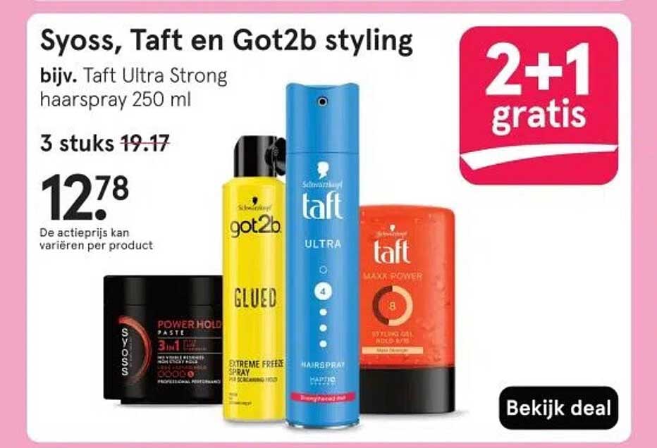 Wil je direct op de hoogte zijn zodra de Syoss, Taft En Got2B Styling in de aanbieding is? Meld je aan voor onze aanbiedingen-alert. Zo krijg je een melding zodra het product tegen een voordelige prijs beschikbaar is.