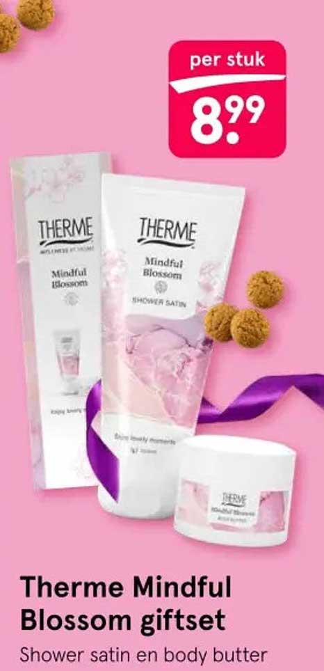 Ben je op zoek naar een perfecte manier om jezelf te verwennen of iemand anders een glimlach te bezorgen? Kijk dan niet verder! De Therme Mindful Blossom giftset biedt jou een luxe ervaring in je eigen badkamer. Met deze set maak je van elke douchebeurt en verzorgingsmoment een ritueel dat je helpt om te ontspannen en jezelf te omarmen. Deze aanbieding is geldig van 3 november tot en met 7 december 2025, dus mis het niet!