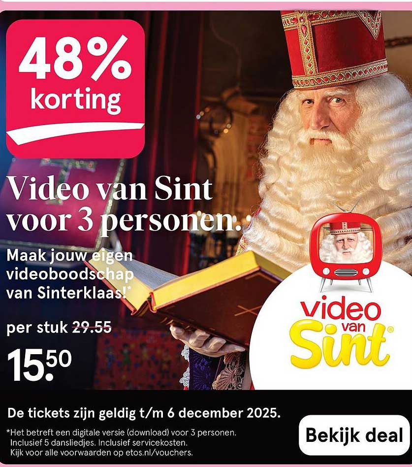 Bekijk nu de Video van Sint voor 3 personen. aanbieding in de Etos folder. Deze aanbieding is geldig van 03-11-2025 tot en met 16-11-2025.