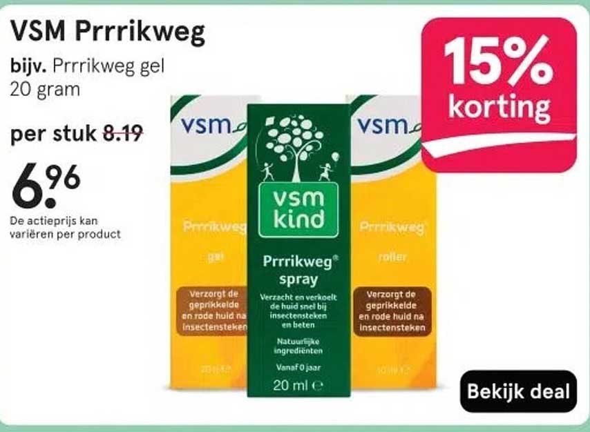 De normale prijs van VSM Prrrikweg bedraagt €8,19, maar hier profiteer je van een mooie korting van 15%, waardoor je het product nu voor slechts €6,96 kunt kopen. Dit is de ideale gelegenheid om dit product in te slaan, vooral als je de komende weken veel buitenshuis bent.