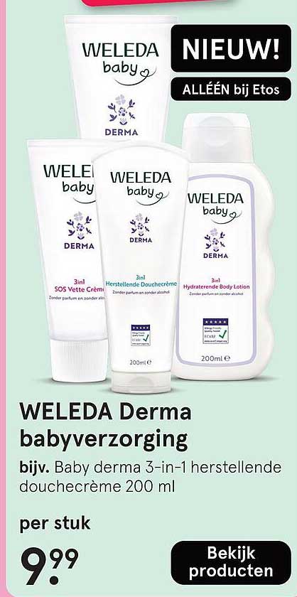 Ben je op zoek naar hoogwaardige verzorging voor je baby? Dan is deze aanbieding bij Etos zeker iets voor jou! De WELEDA Derma babyverzorging producten zijn speciaal ontwikkeld om de gevoelige huid van je kleintje te beschermen en te hydrateren. Het maakt niet uit of je een nieuwe ouder bent of al wat ervaring hebt, met deze producten geef je je baby de beste zorg.