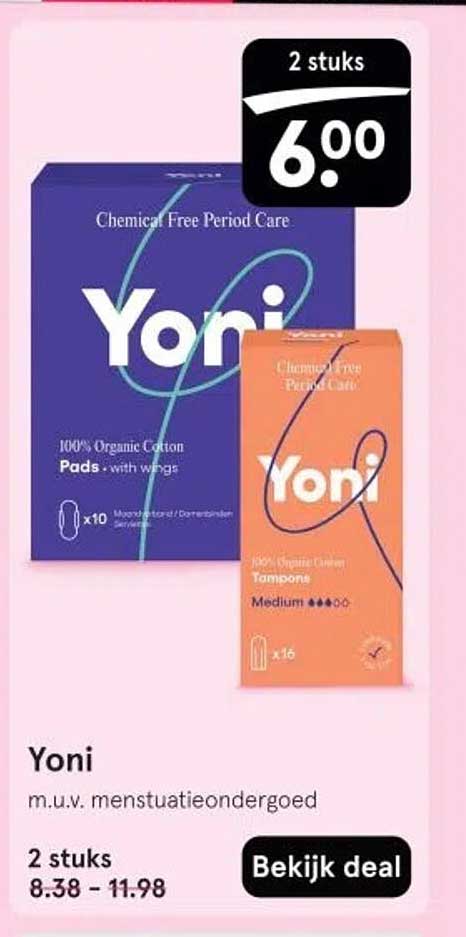 Ontdek de geweldige aanbieding van Yoni, waar je nu 2 stuks kunt kopen voor slechts €6,00. Yoni staat bekend om zijn duurzame en chemicaliënvrije producten, waardoor je met een gerust hart kunt kiezen voor jouw menstruatiezorg. Deze aanbieding is niet alleen vriendelijk voor je portemonnee, maar ook voor het milieu!