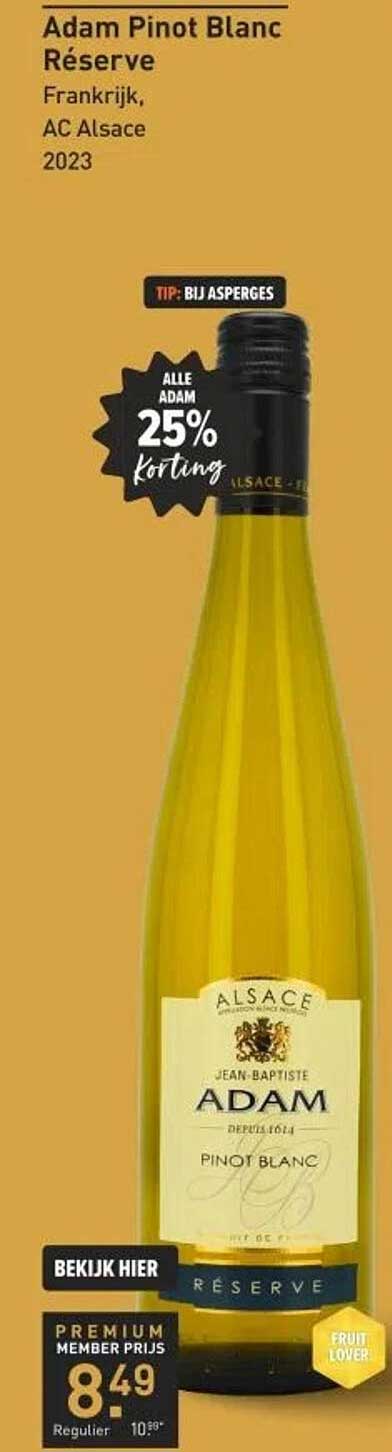 Ben je op zoek naar een heerlijke wijn die niet alleen smaakvol is, maar ook ideaal voor verschillende gelegenheden? Dan is de Adam Pinot Blanc Réserve echt iets voor jou! Deze wijn uit de prachtige regio Alsace in Frankrijk biedt een verfijnde smaak en is perfect om te genieten met vrienden of bij een mooi diner. De aanbieding die we hier bespreken, loopt van 10 juni tot en met 15 juni 2025, dus grijp deze kans!